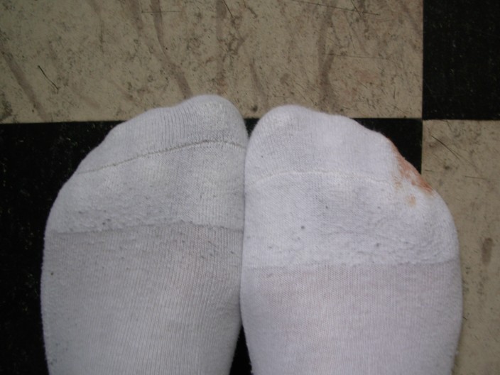 Taking off the socks at home revealed several blisters on the outer toes, not a pretty sight [left foot] [right foot], resembling frost bite.