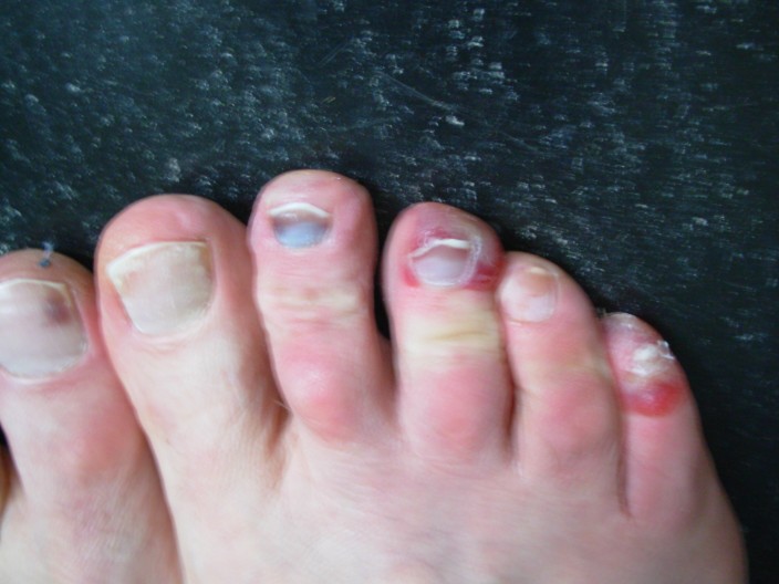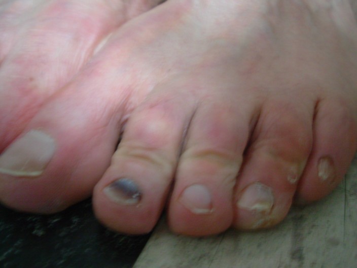 On Tuesday I spent half an hour treating blisters, clipping the dead skin with scissors. The skin damage on my toes resembled a light frostbite. The right-foot toe nail fell off.