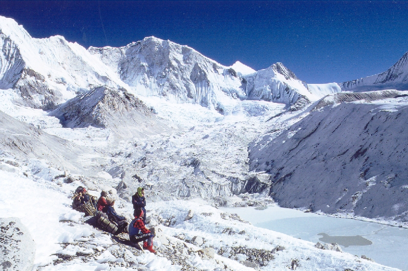 This was the trickiest part of our trek, one of the highest crossings from Makalu Base Camp at 4900 m in the Arun Valley region, going West to Baruntse Base Camp at 5450 m in the Everest Region, a 4 day crossing. We decided to acclimatize at 5750 m before the passes using a two-day rest and during the day of crossing it would take 8-10 hours for the specially selected high altitude porters and help of the climbing Sherpas to cross the two steep passes with two multi-pitch rappels (abseils) of 100-200 m each.