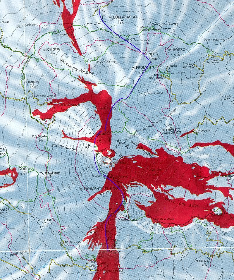 Overview map of Etna. In blue, cross Etna route from Sapiensa to