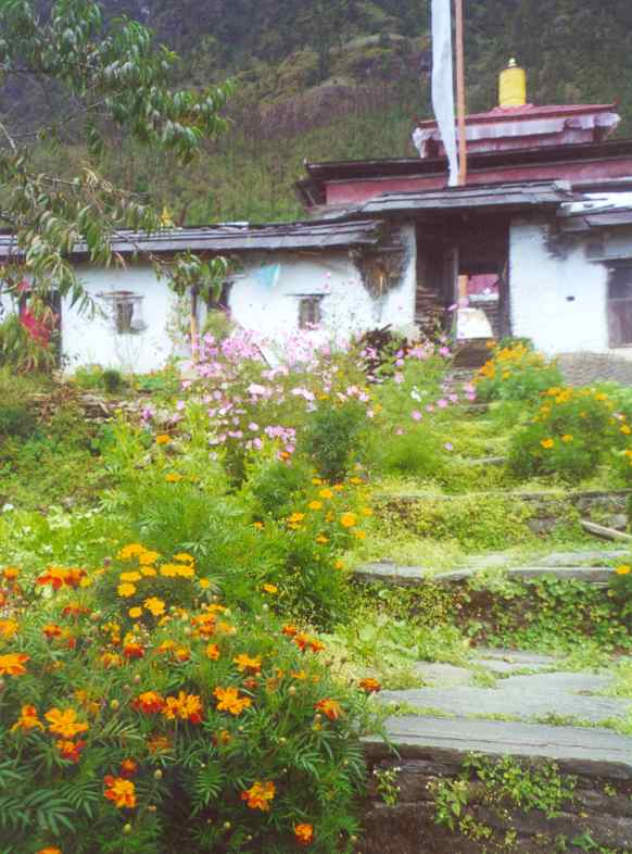 Womens monastory of Bigu Gompa: main gompa with flowers