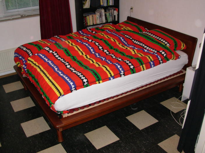 The new bed at home, with brown paint.