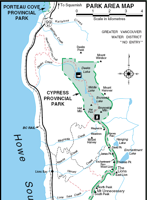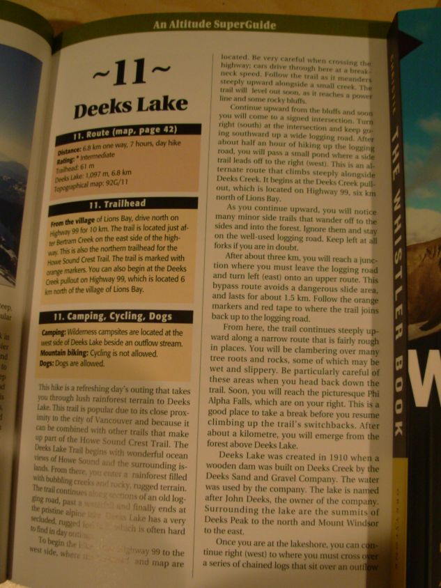 There are two options, the 6 hour trek up and down Deek's Lake at 1100 m or continue to Brunswick Lake (xx m) cross hat Pass (xx m) and go down to Lions Bay at the highway, a 10 h trip. We took the shorter 6 hour trip.