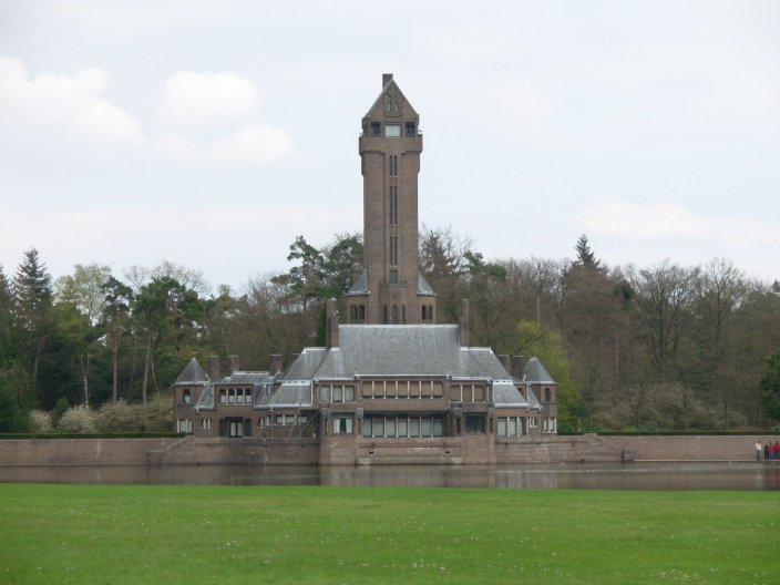The lodge is six km from the NW entrance of the Hoge Veluwe Park, past moors and pine forests,. It appears suddenly in a wide open space on a km distance and looks bigger than it is, enhanced by the tower, the large pond, the broad plan and large open space. It is very much a stylish “castle”.