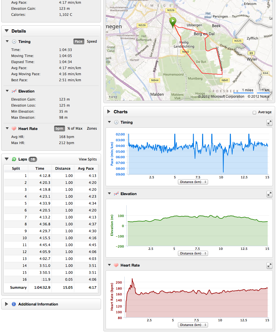 Time 1:04:32 over 15.05 km, 14.00 km/u, 4:17 min/km.