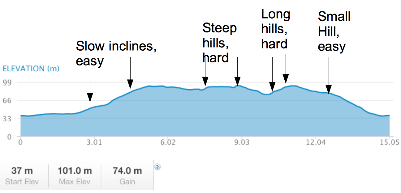 Once you are past the 11 km you may decide to go flying. From here, most of the route goes down-hill and there is only one more small hill, the 7th. The last few hundred meters before the finish also go up.