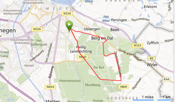 The first 5 km is along the Groesbeekse weg, a two lane tarmac road with plenty of space. There are two slow inclines, or "heuvels", net going up is 50 m over 5 km.