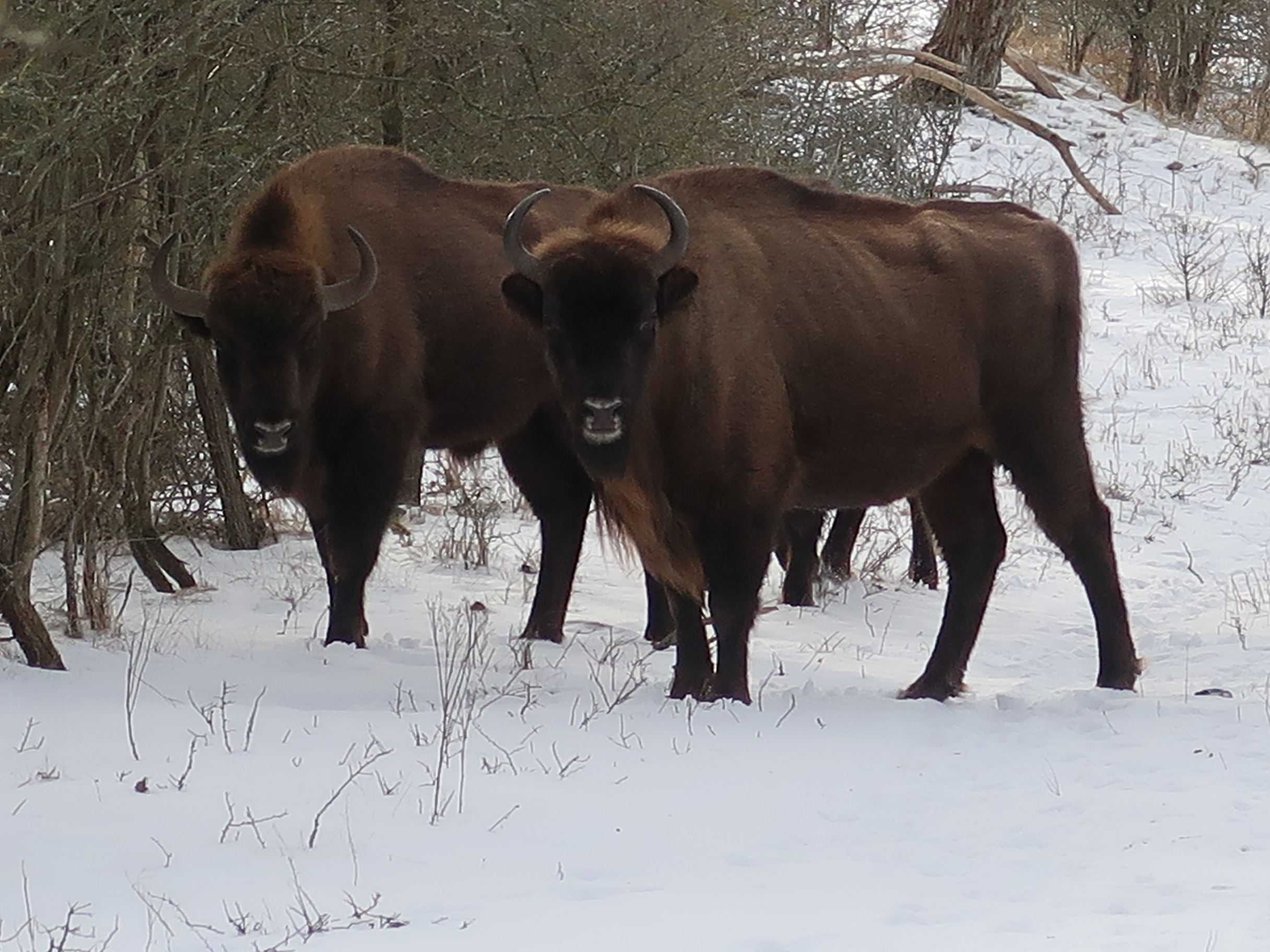 At the wisentuitkijkpunt, West of Overveen, rare snow conditions. Eye contact.