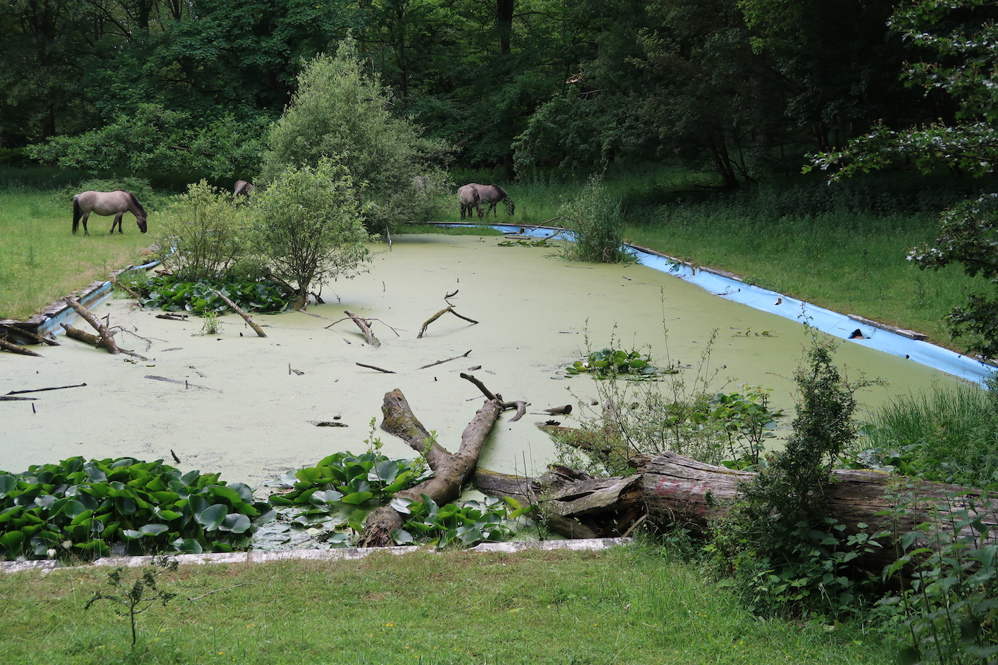 Konink's horses at the rewilded (since at least 40 years) Duinlust Park pool, the old hospital pool for revalidating patients.