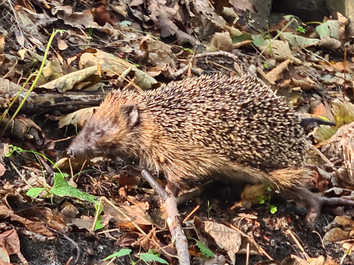 Hedgehog up the hill of the beech forest in the old and closed Hospital park, South-West of Duin en Kruidberg.