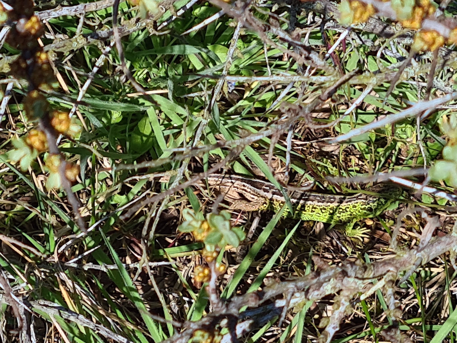 Lizzard = zandhagedis (in Dutch), camouflaged. Centre of picture (click on picture to enlarge, it is there!). East of Cremerlake, side trail, 200 m North-West of the cycle path/Olmenpad bench. Clearing the dunes on behalve of the lizard seems to work.