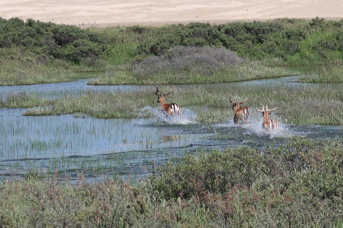 Deer fleeing using the lagune, 1.5 km North of Paranassia. They could have used the bushes but decided for a safer route. Wolves are much slower in water, instinct.