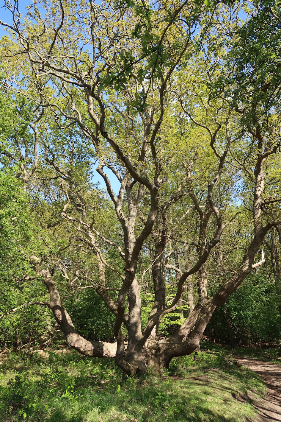 Medusa Oak, 1.5 km West of Duin en Kruidberg, along the blue trail, along the “Jagtlustweg”. This type of tree with many branches originates from fire wood cuttings.