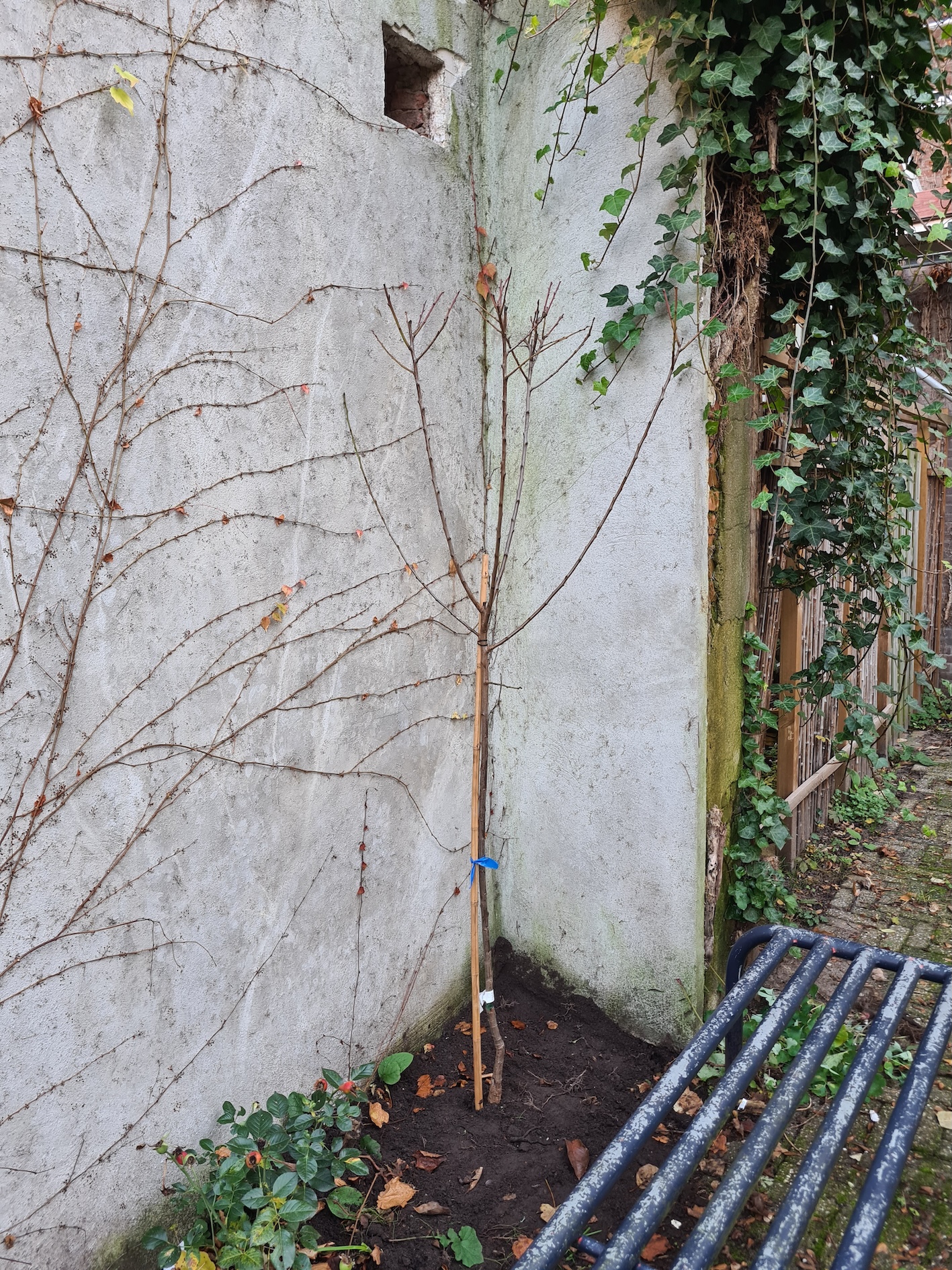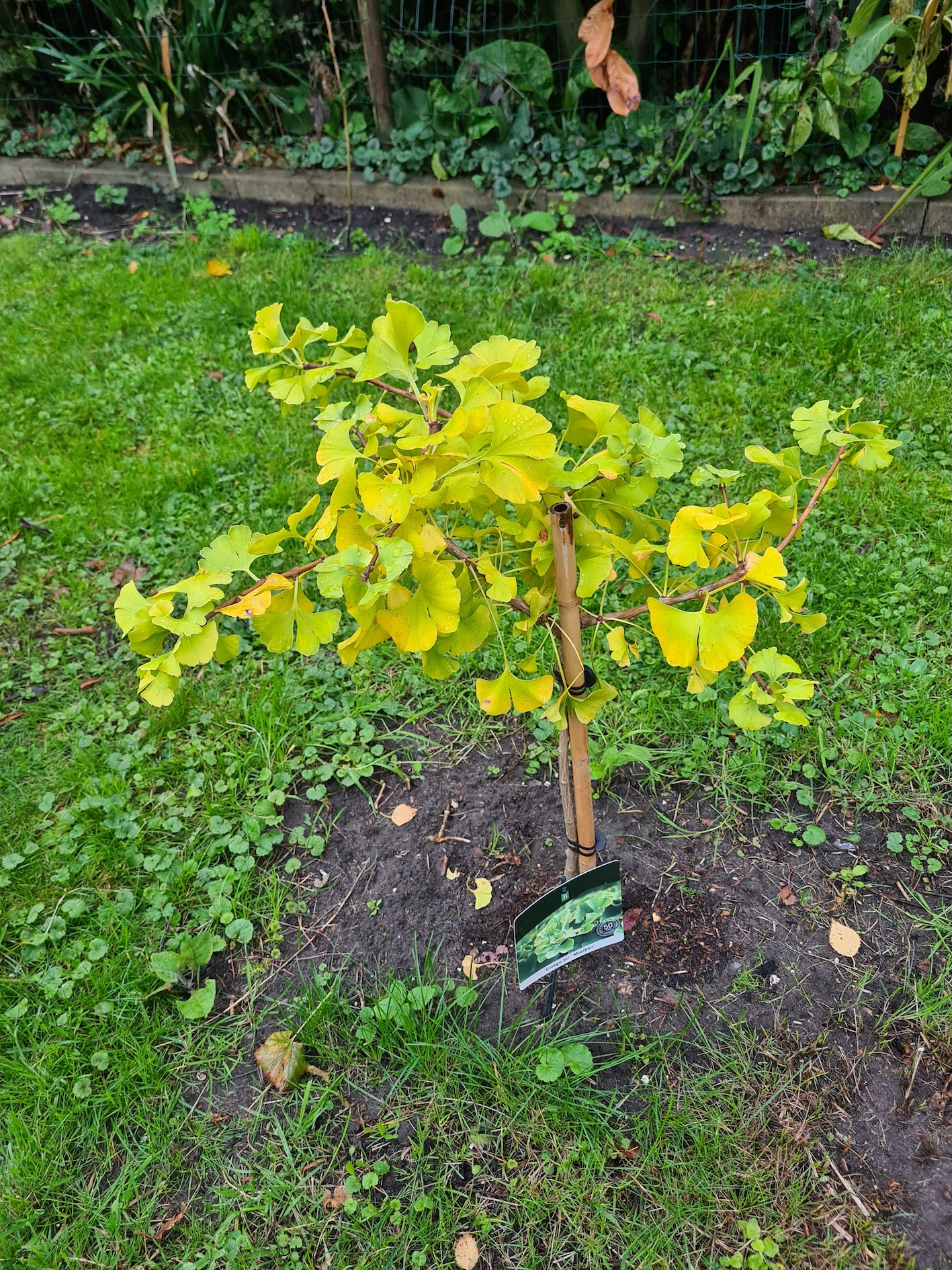 A Gingko 'Marieke' bush was planted next to the Rhododendron. Both can reach a height or around 2 meters but this will take 10-20 years.