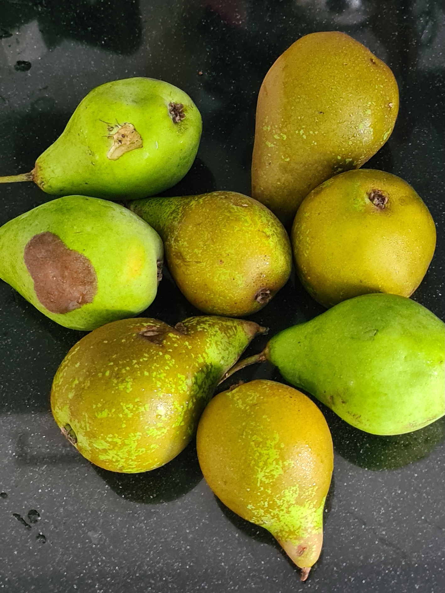 We have two pear trees, both with edible Conference pears. Total amount is around 5 kg. One tree is partly overhanging at the neighbors, across the wooden fence so we used a butterfly net to recover those. The pears still need to sweeten by waiting 1-2 weeks but don't wait too long, they could rot. The other pear tree has very green pears, we will try to cook them for preserving for the winter.
