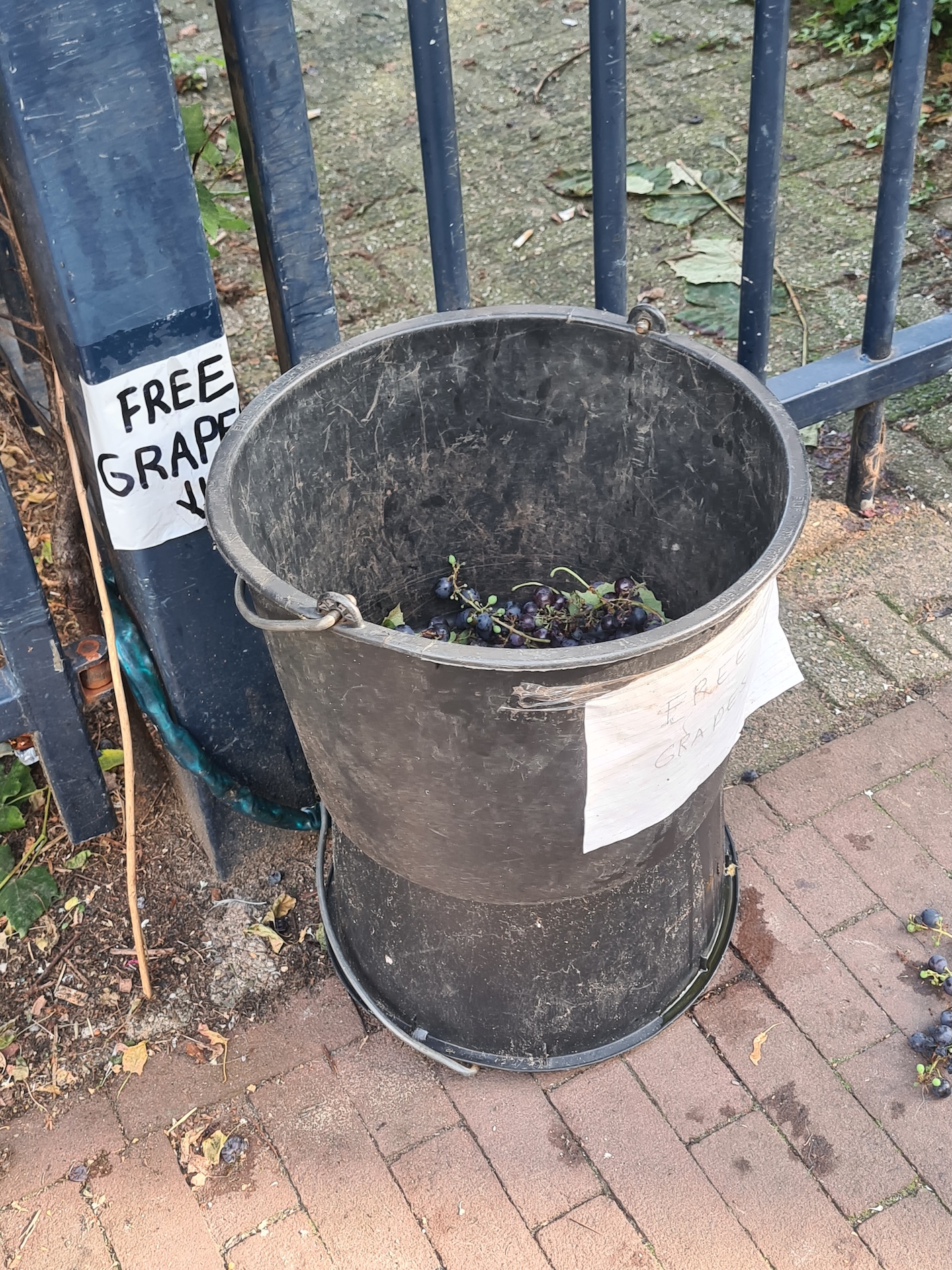 This year the amount of grapes are enormous and the grape size is good, some 25 buckets or baskets, around 150 kg. This created a commitment, just pick them all. With a potential of 75 liters of grape juice, we started thinking of buying a proper grape press and wine fermenting bottles for next year. This year we will try 5 liters.