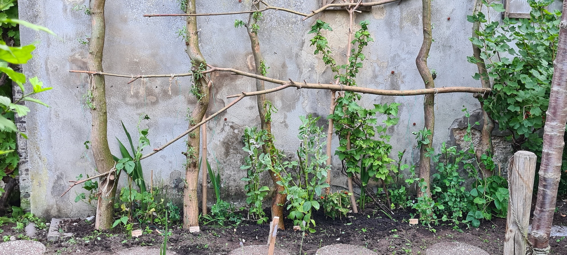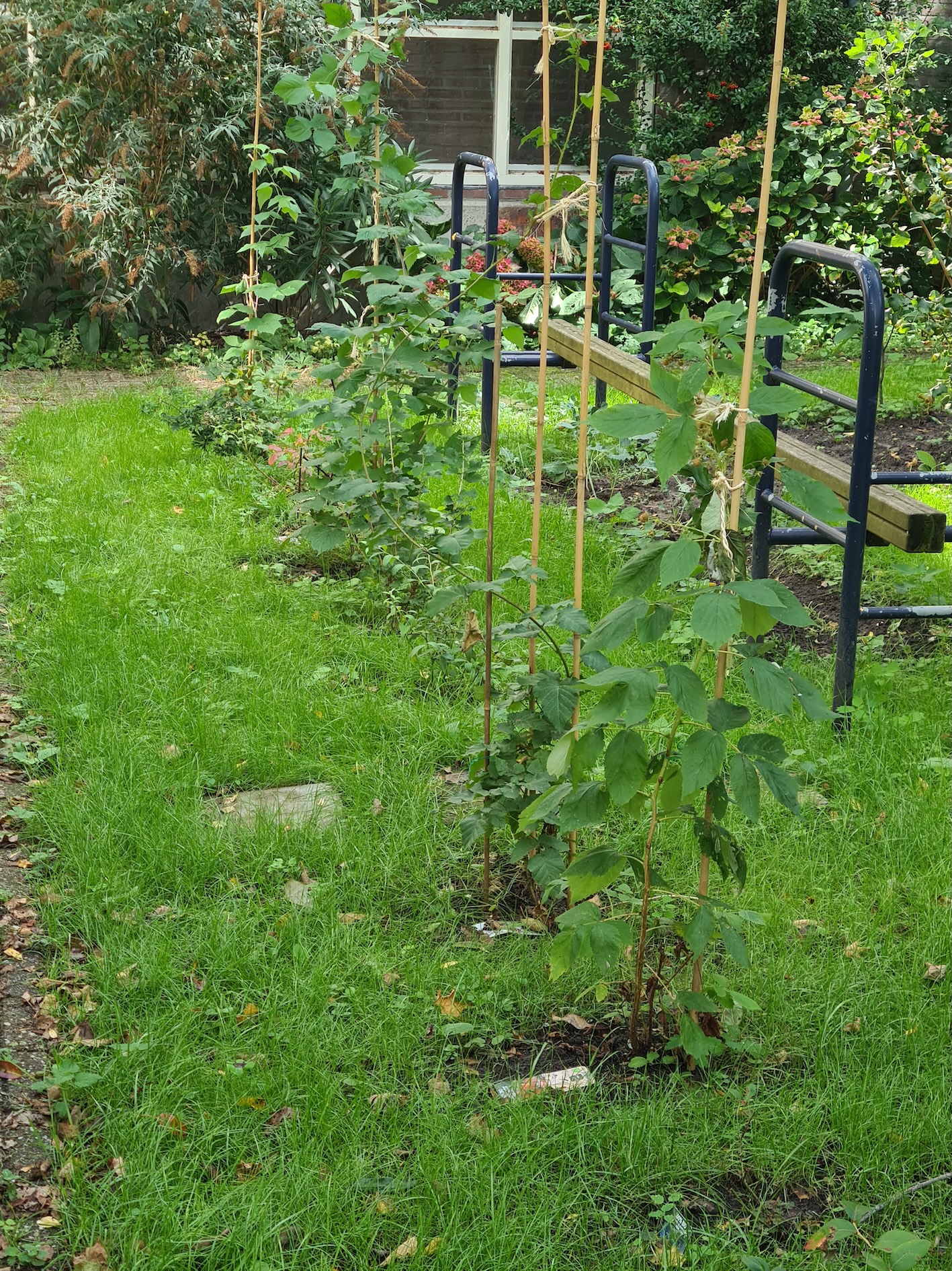 Next to the large shed in the middle of the garden, a climbing rose was planted. Idea is to create a large bow along the wall.
