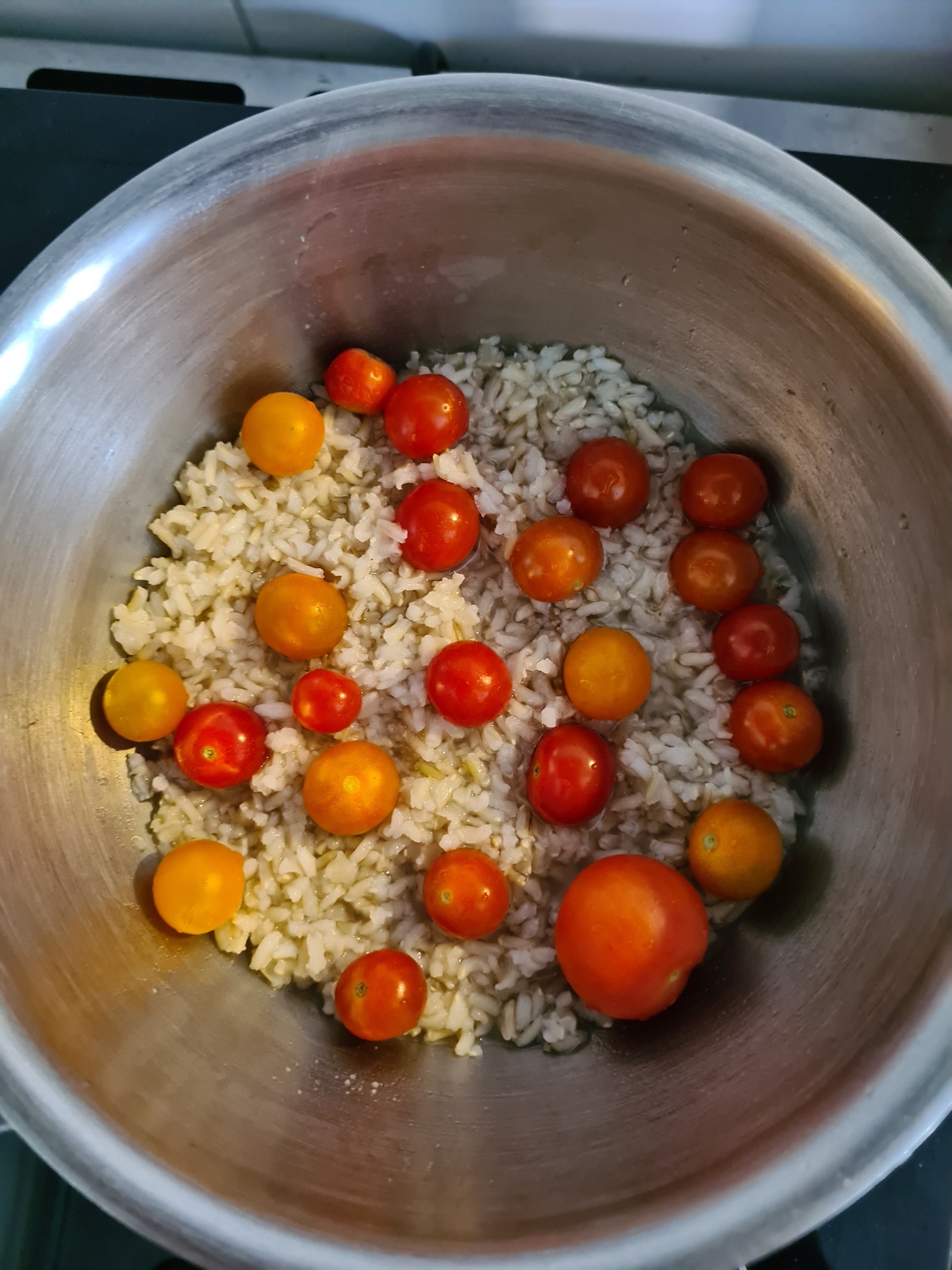 Rice with heated cherry tomatoes, they burst when eating which give a strong taste.