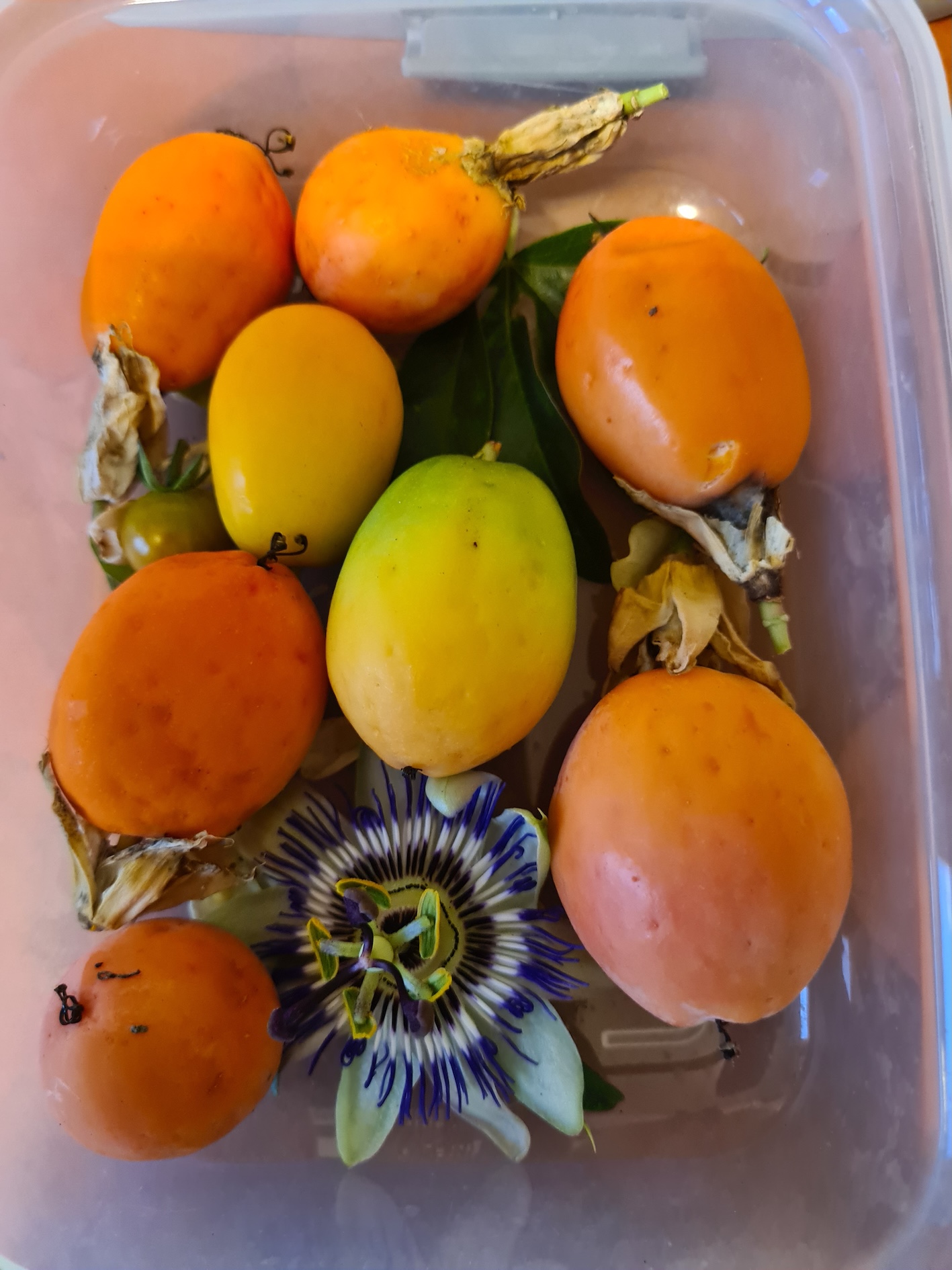 The passionfruit plants are old, some 25 years. They have red fruits inside but are not sweet. Still, looks nice.