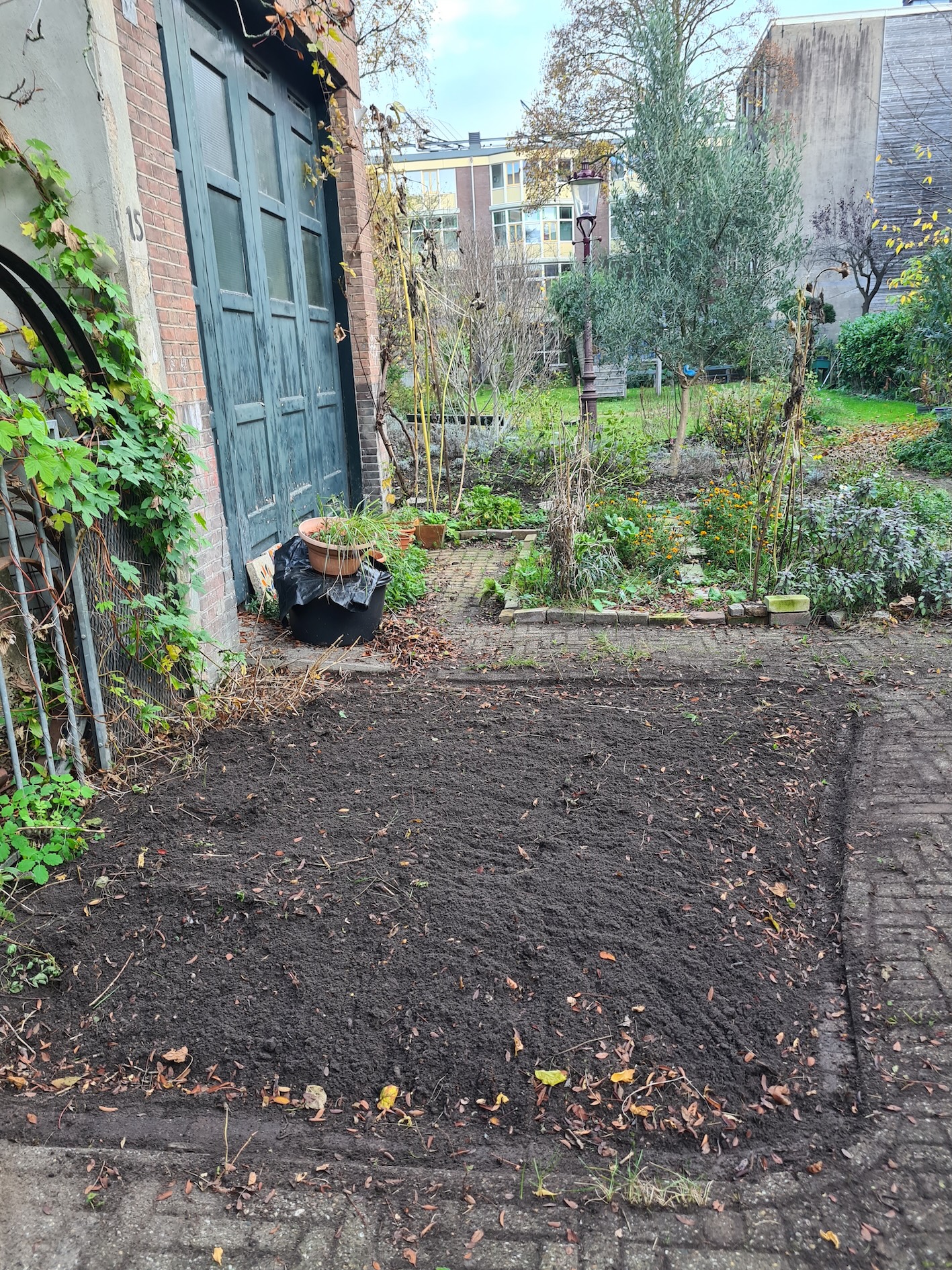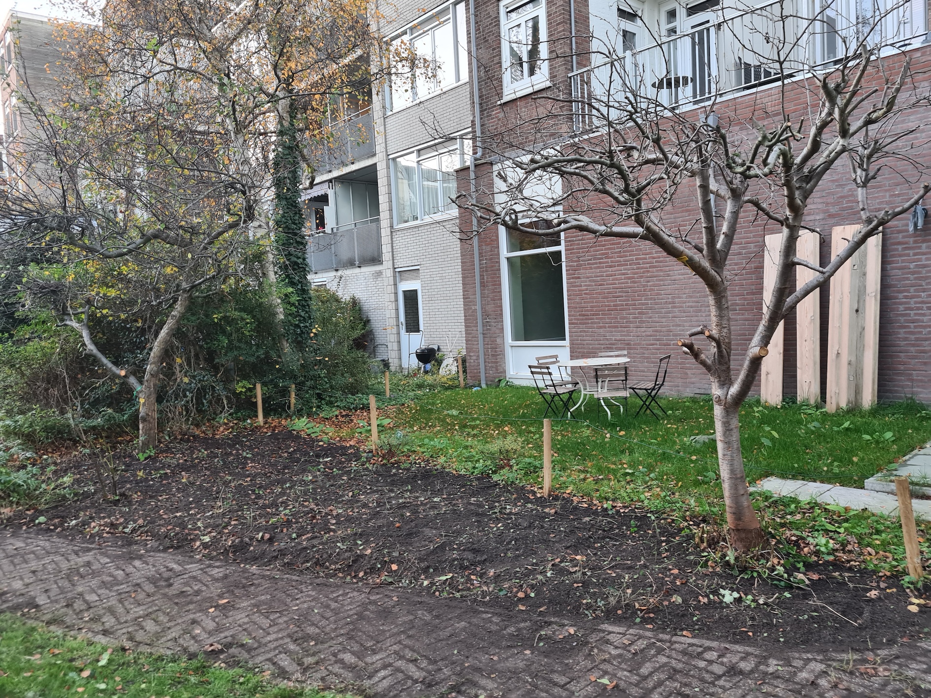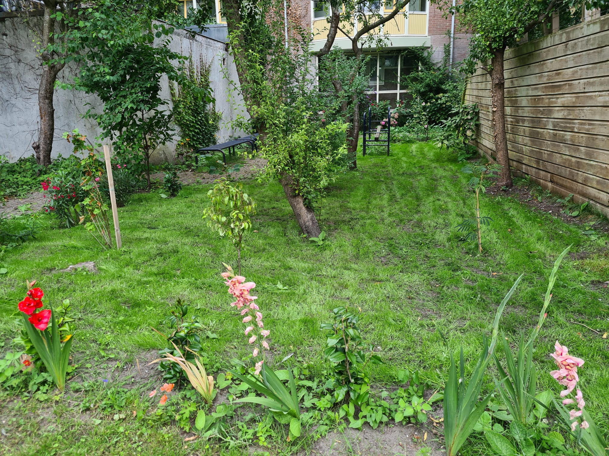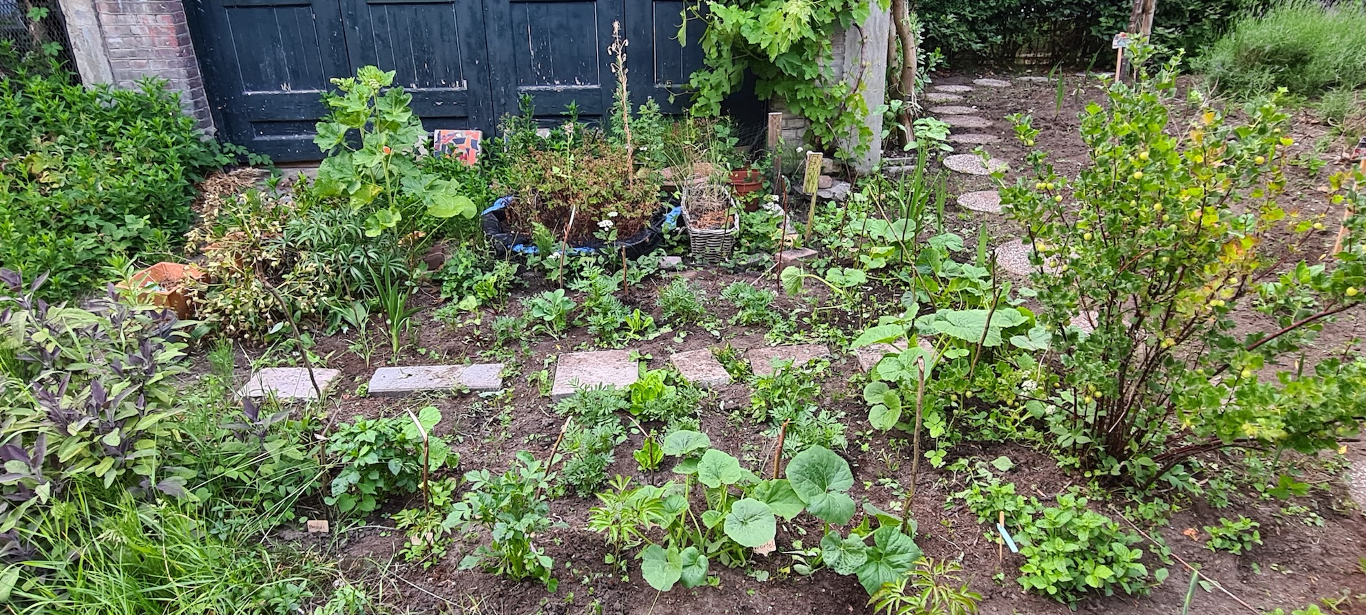 The South-West side of the garden is too wild, the pussy willow (?) and xxx were far to big and the rock garden with Coral Bells (purperklokje) (heuchera) (mostly low purple leaves) overgrown with blown in long gras and long strings of summer strawberries due to heavy growth by wet spring and summer. Also, around the Japanese cherry tree, weeds dominate.