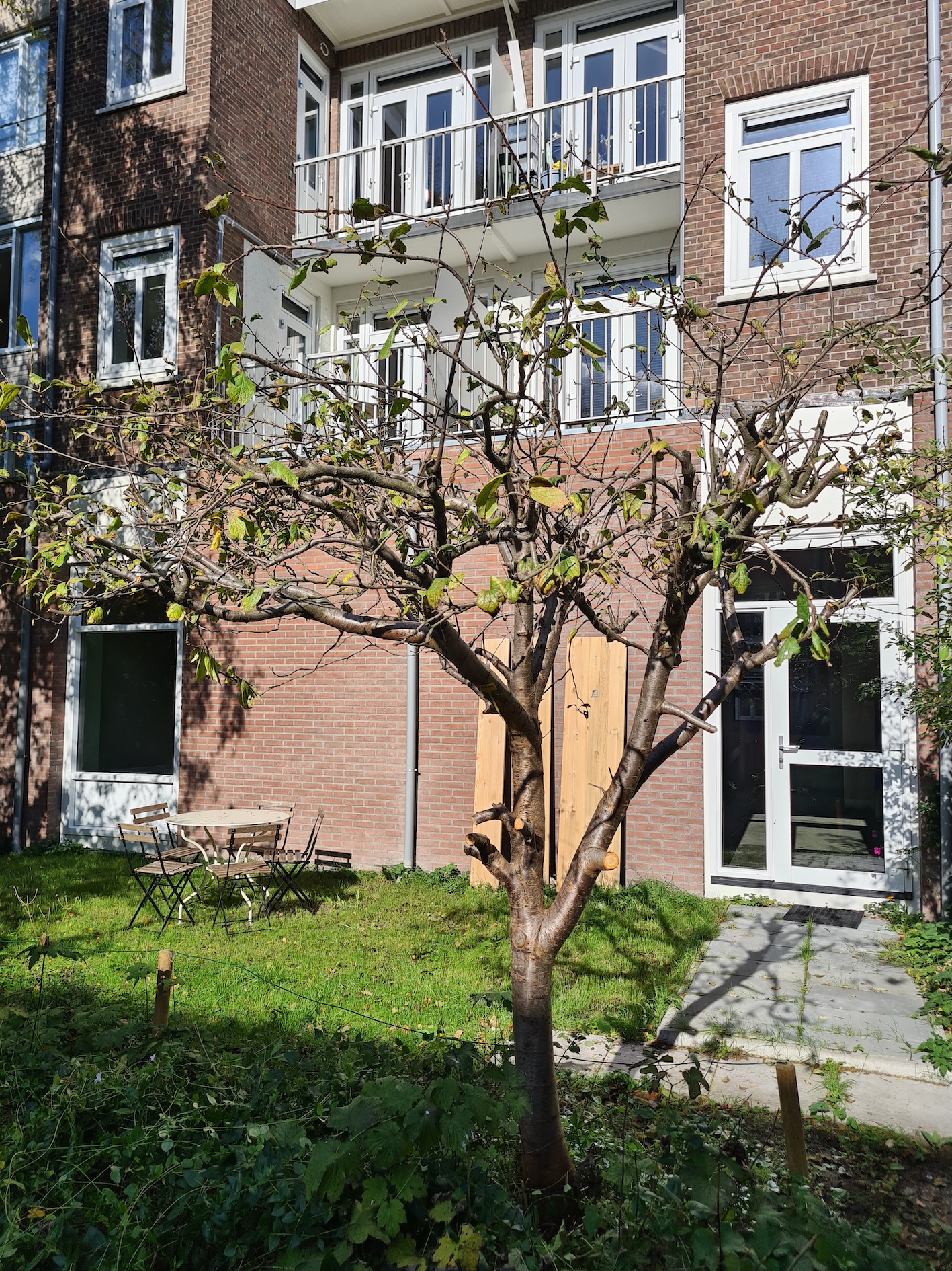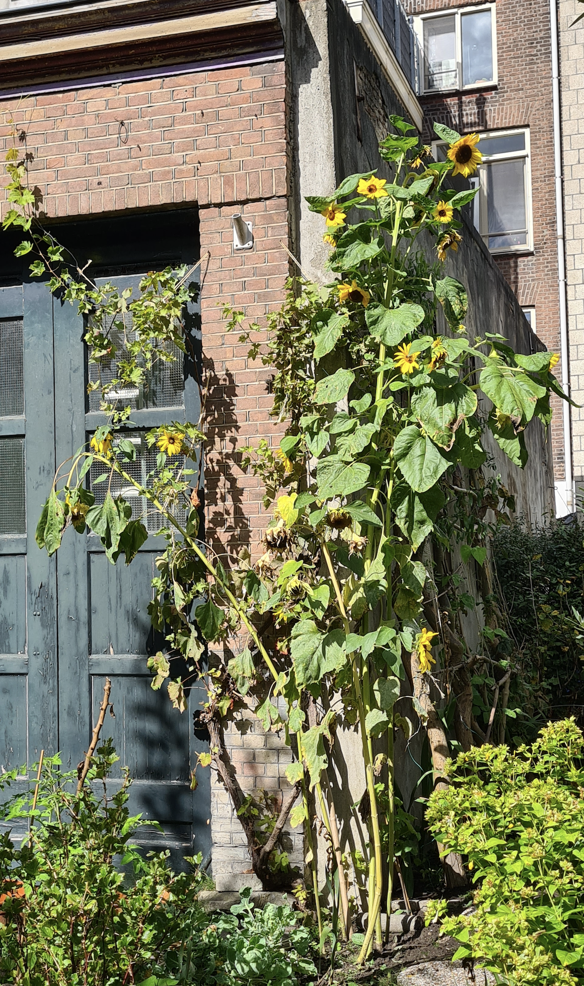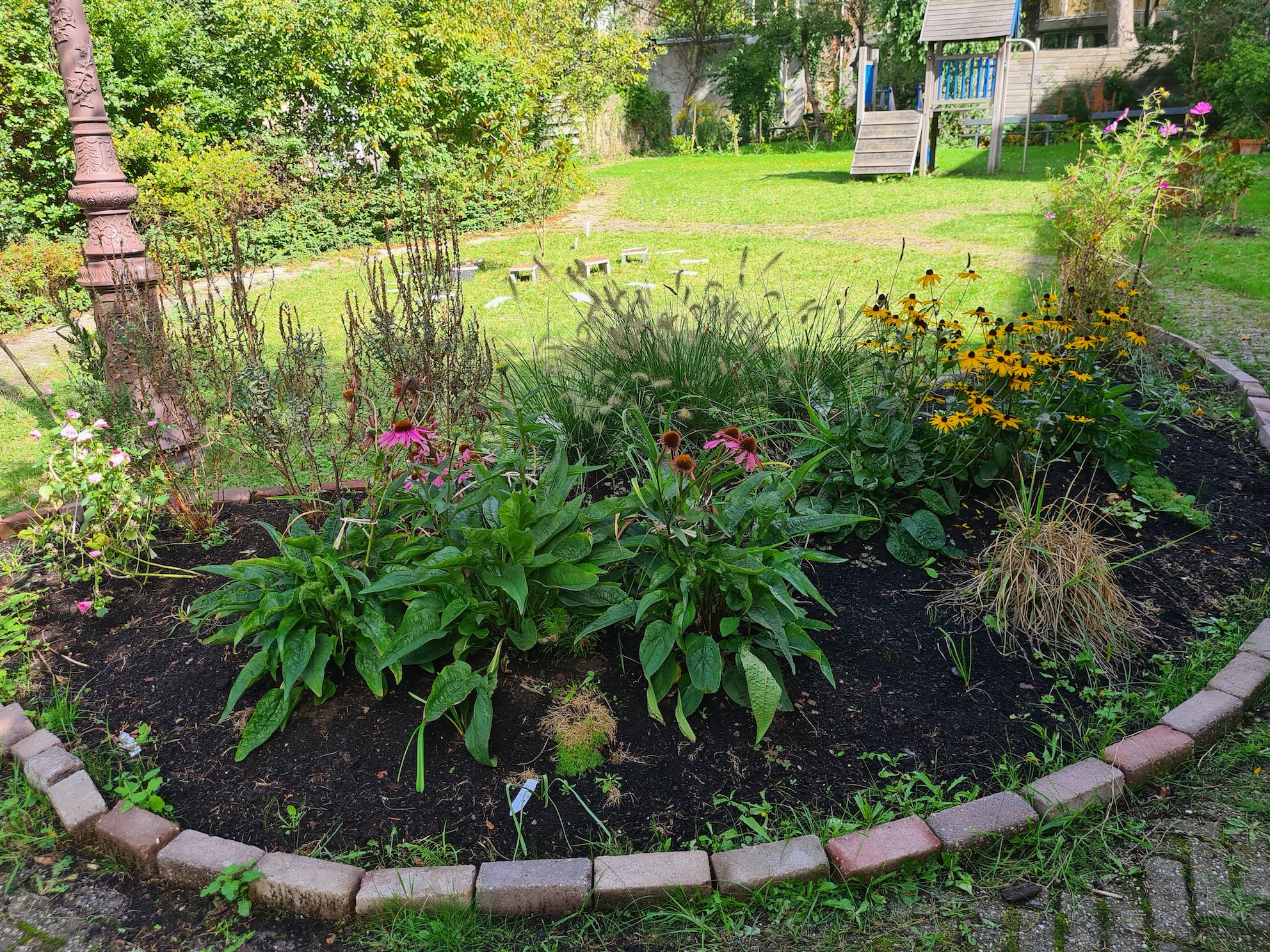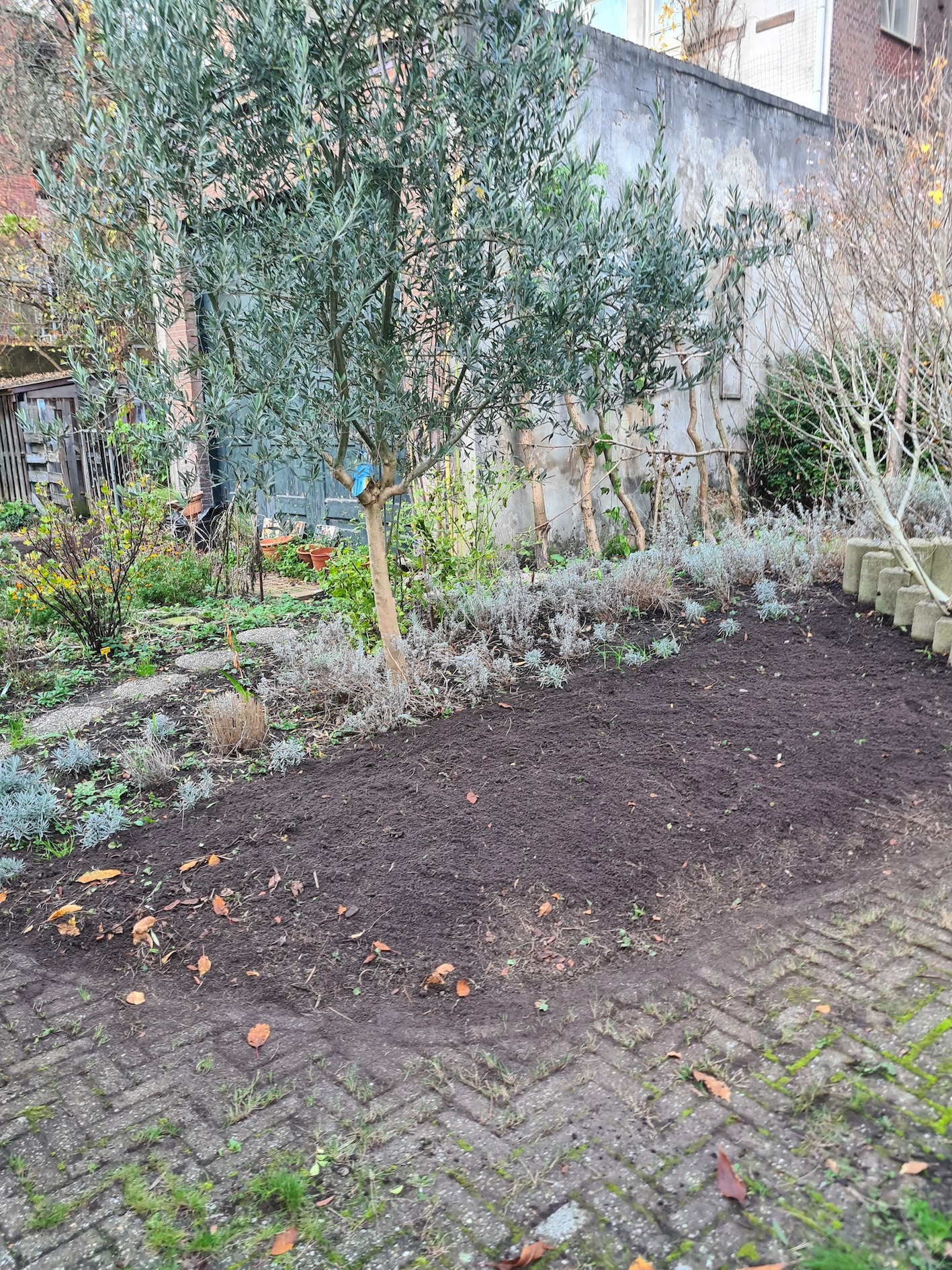 The South-West side of the garden is too wild, the pussy willow (?) and xxx were far to big and the rock garden with Coral Bells (purperklokje) (heuchera) (mostly low purple leaves) overgrown with blown in long gras and long strings of summer strawberries due to heavy growth by wet spring and summer. Also, around the Japanese cherry tree, weeds dominate.