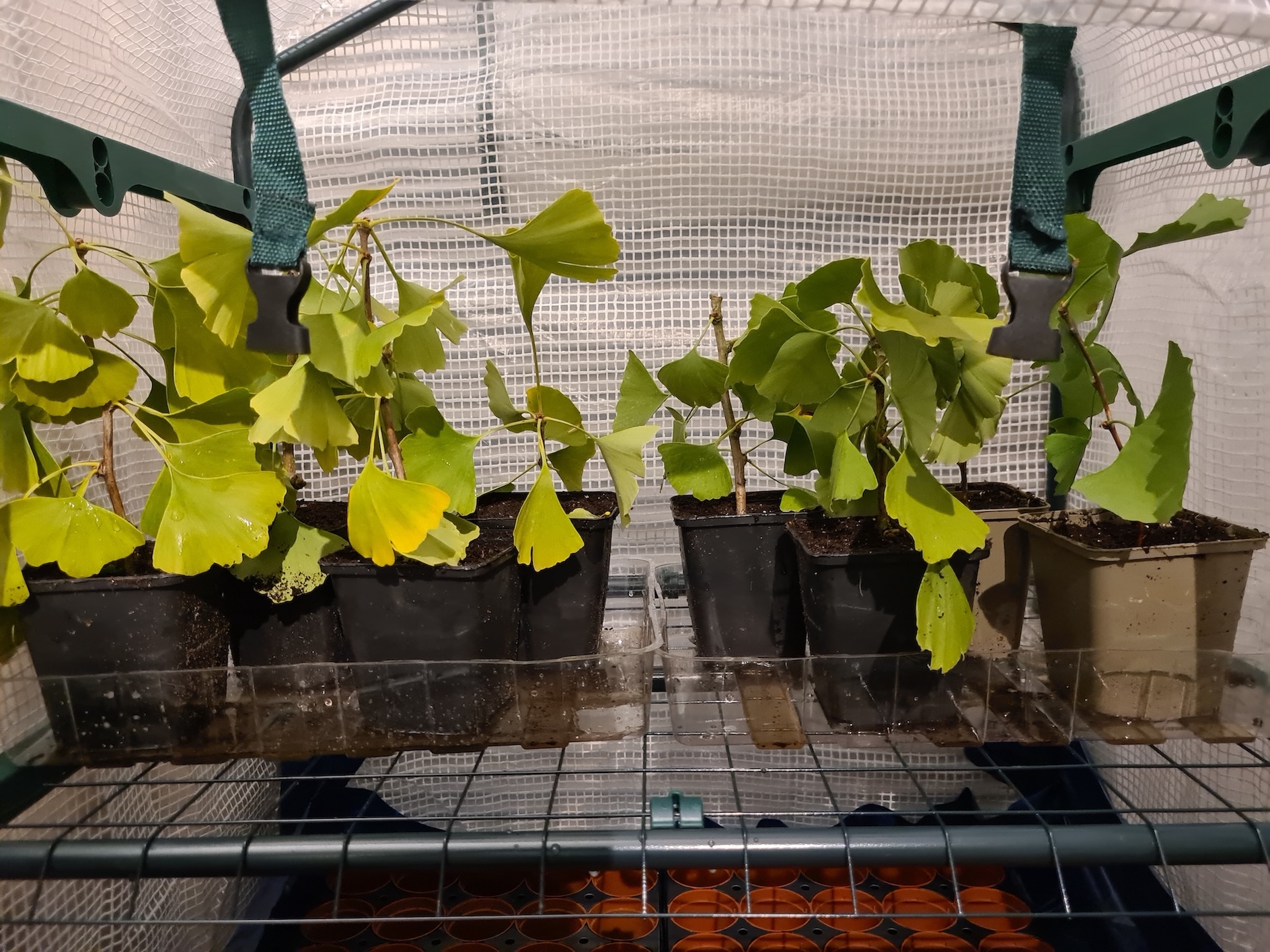 Gingko cuttings from a female (6x, black pots, Driehuis tree) and male tree (2x, grey pots, Jordaan tree).