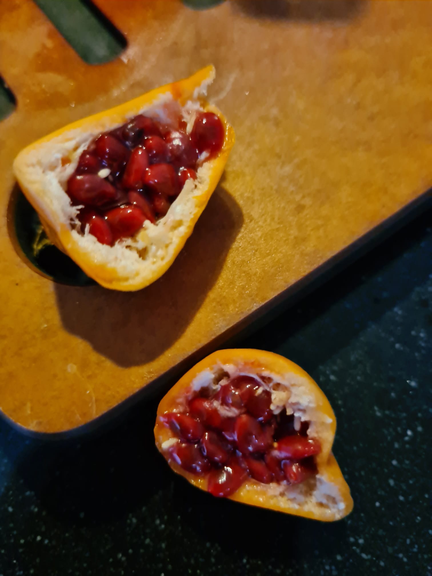 Passion fruit, red fruit inside, mildly sweet, with seeds.