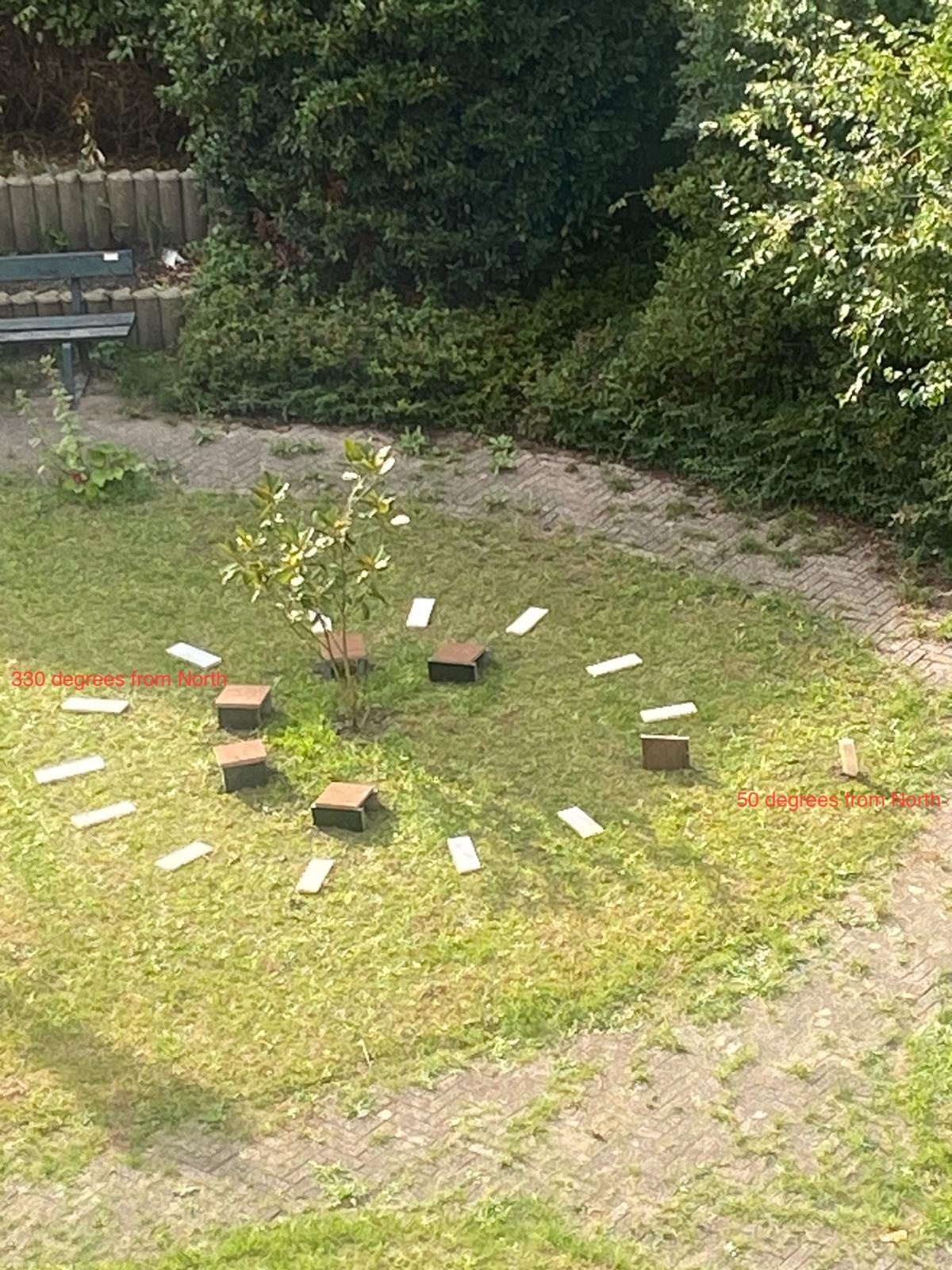 We decided a buy a bigger one, and protect it with stones again. I still had natural stone slabs of granite, diorite and marble used for kitchen countertops or tables so I decided to have them cut up in Overveen in many pieces to duplicate the Stonehenge lay-out. The marble stones are flat lying and reflect the sun, just like the Egyptian pyramids 4500 years ago which were fully covered with marble.