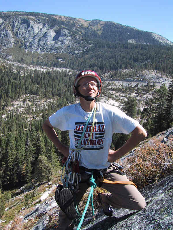 | Climbing a 5.8/5.9(5b/5c) crack/slab on Daff Dome. High east side, near highest forest.